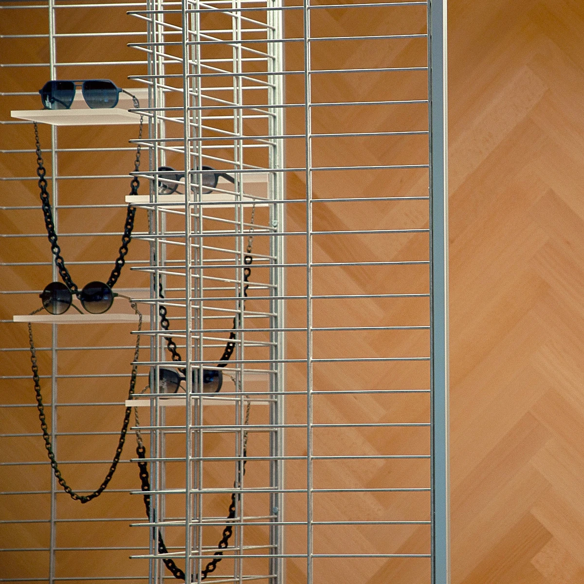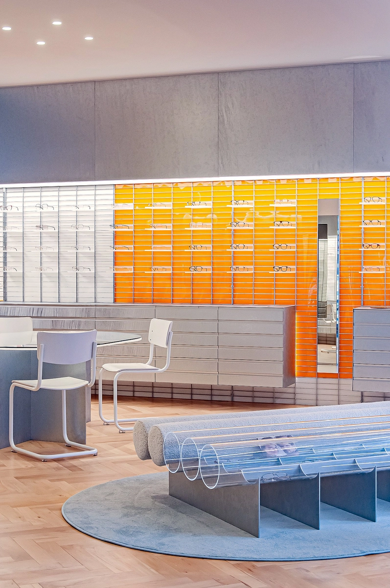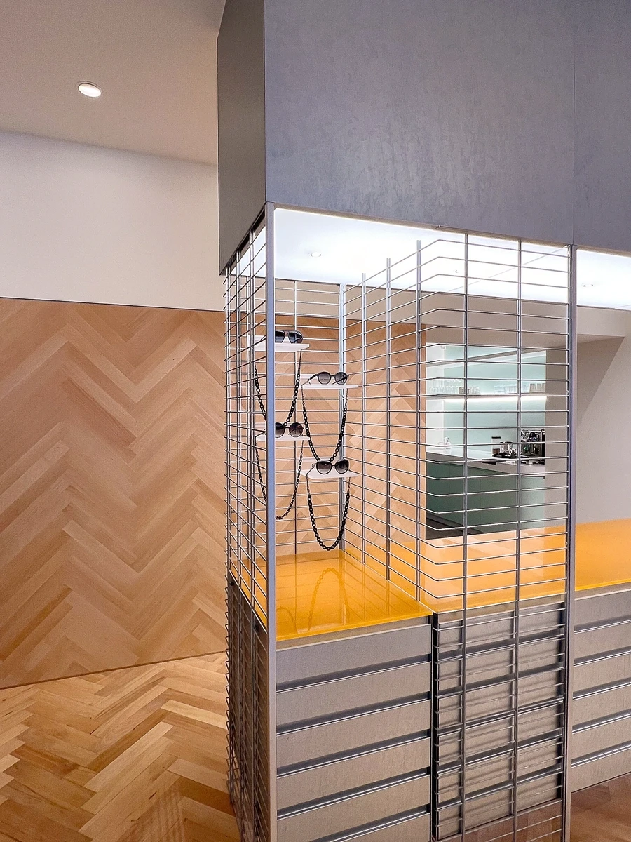 Damit die Brille so schwerelos wie auf der Nase liegt, präsentiert sie sich auf zarten Plexiglas-Bords, die in die Doppelstabmatten eingehängt werden. Was oben schwebt, findet unten Halt, was oben durch Stahl und Plexiglas kühlt, wird unten gewärmt: Fischgrätparkett. Orange- und türkisfarbene Akzente unterstützen die Harmonie.
