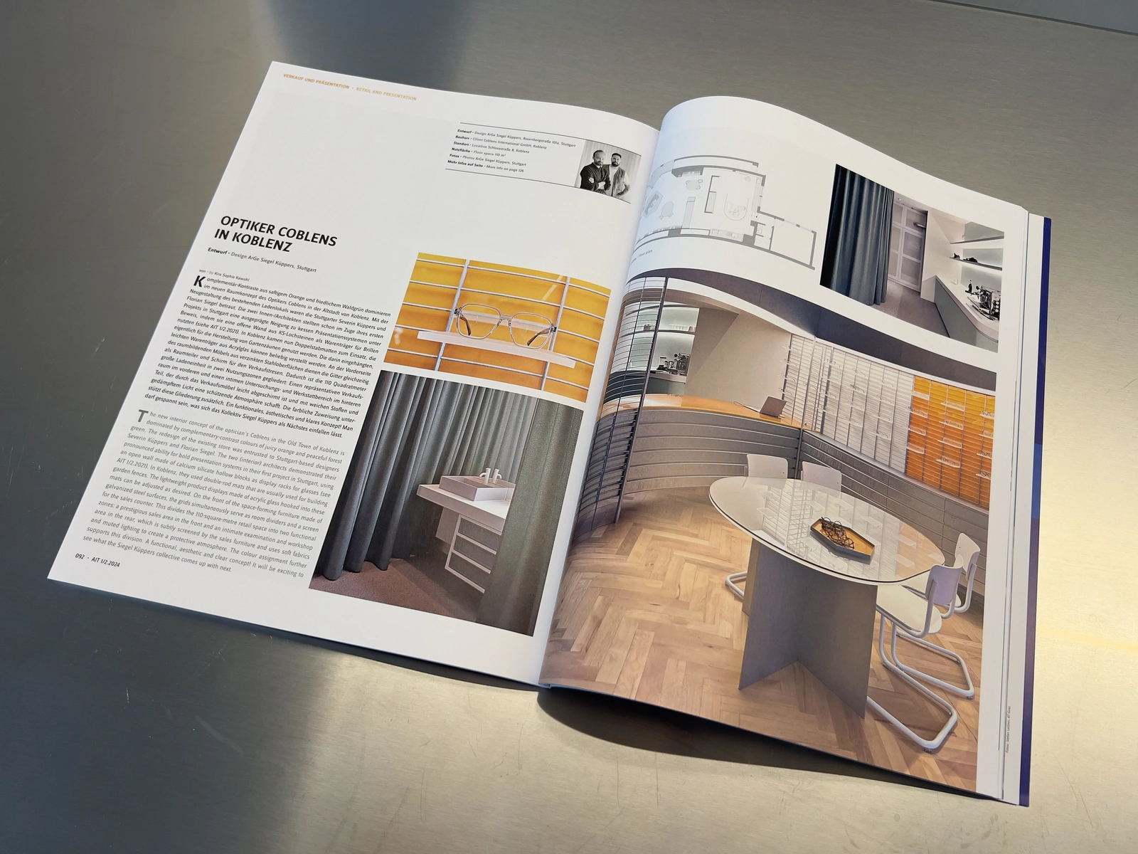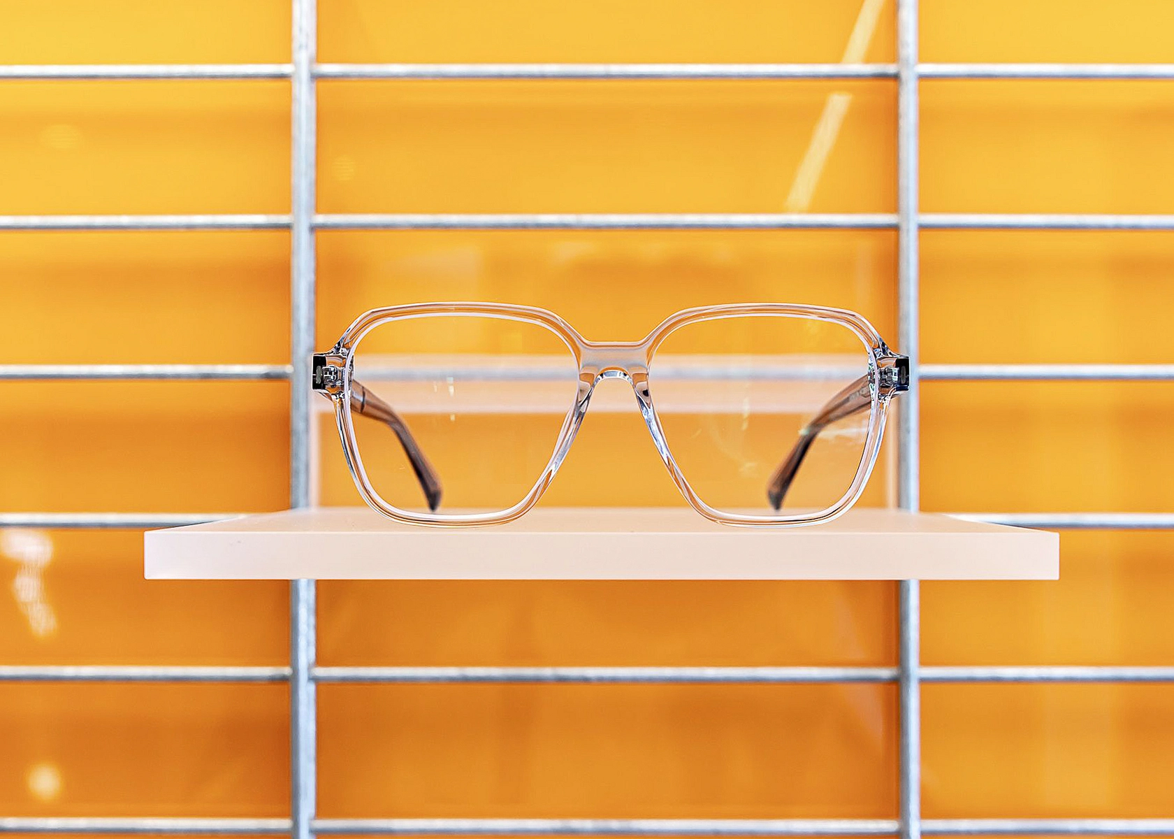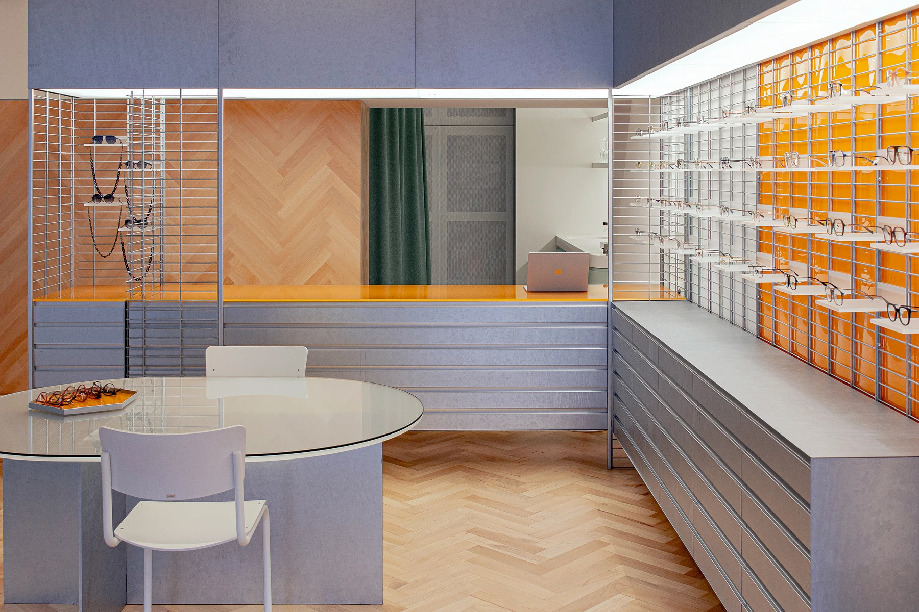 Damit die Brille so schwerelos wie auf der Nase liegt, präsentiert sie sich auf zarten Plexiglas-Bords, die in die Doppelstabmatten eingehängt werden. Was oben schwebt, findet unten Halt, was oben durch Stahl und Plexiglas kühlt, wird unten gewärmt: Fischgrätparkett. Orange- und türkisfarbene Akzente unterstützen die Harmonie.
