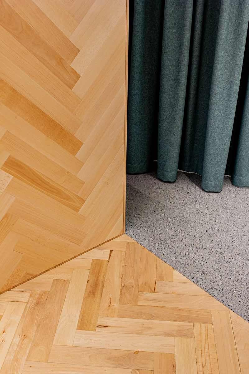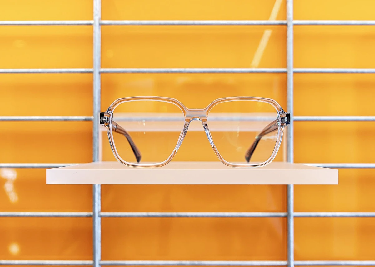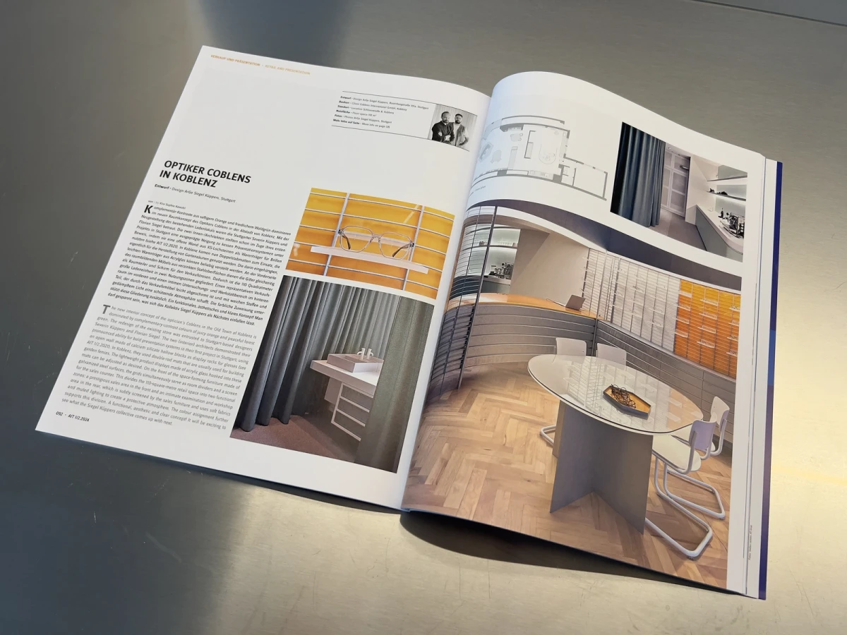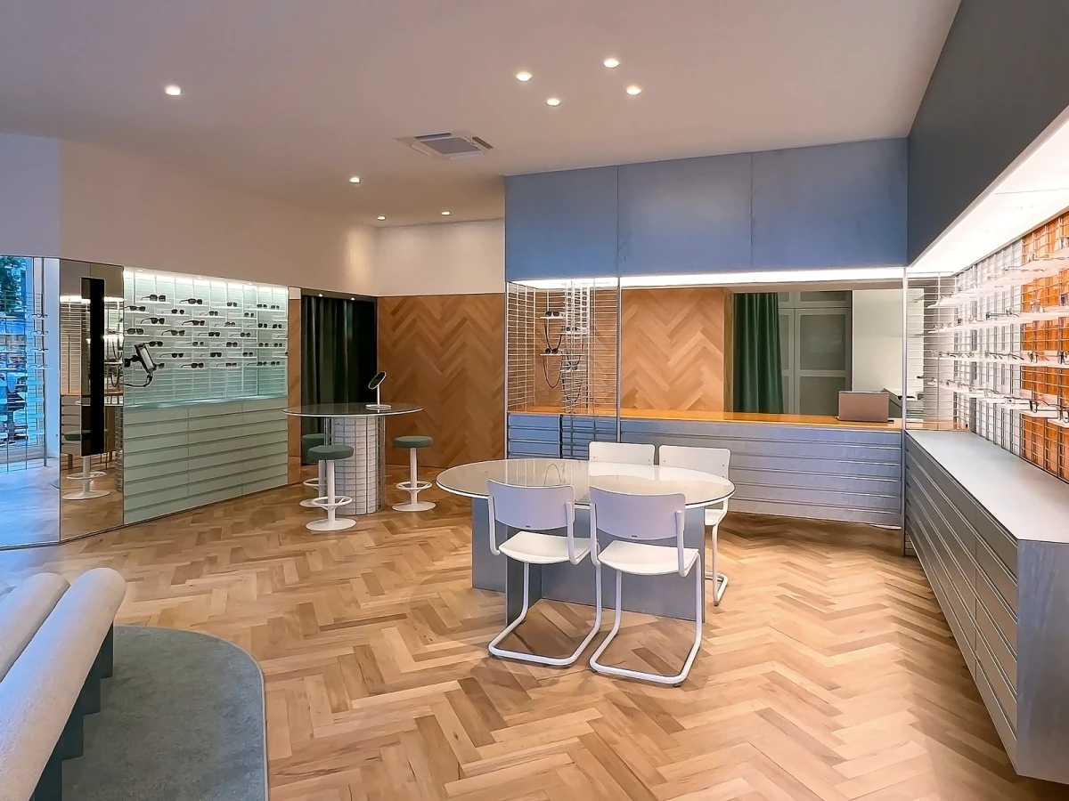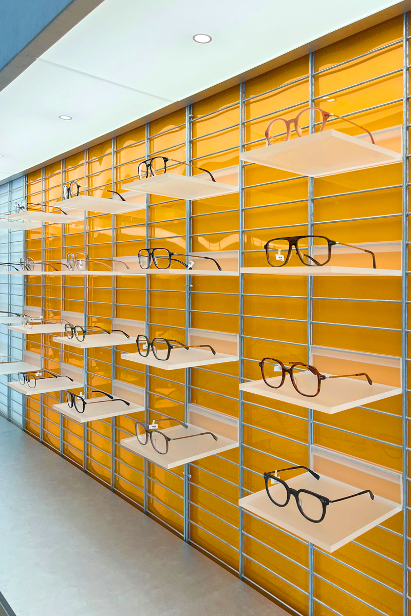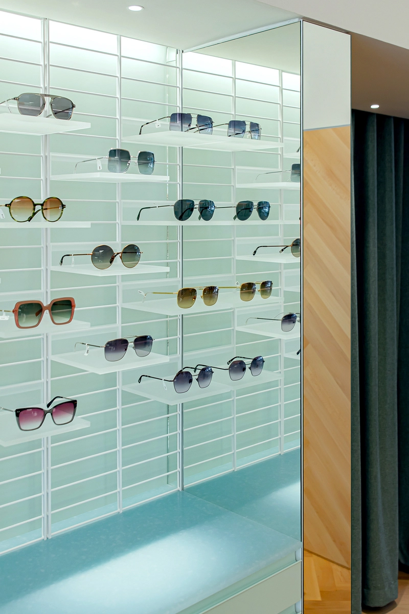 Zwei Gläser, zwei Bereiche – ganz klar. Ein repräsentativer Verkaufsraum und ein separater Untersuchungs- und Werkstattbereich. Die Kombination ist gewieft: Feinfühlig aufeinander abgestimmte Boden- und Wandflächen unterscheiden öffentlich und privat. Und dann … Ach ja: die Brillen! Das Herz des Optikers.