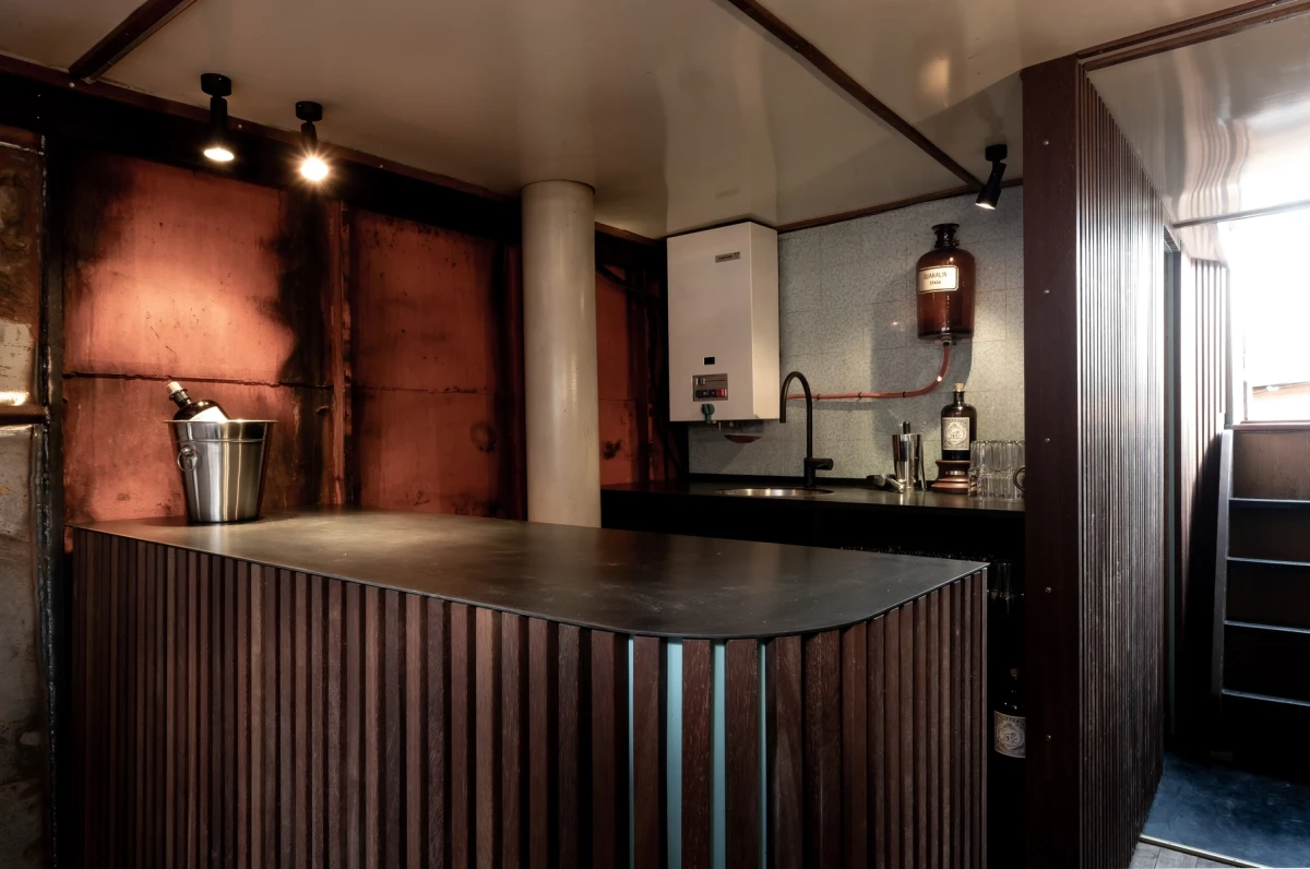 So beschaulich wie das Schiff war auch das Budget. Das hieß: »Recycling.« Challenge Accepted! Um die Materialkosten niedrig zu halten, wurde altes Pockholz aus dem Schiffsrumpf zu neuem Leben erweckt. Geprägt von der Ladung des in die Jahre gekommenen Schiffes, strahlt der Charme des Holzes überall dort, wo es plankt. Größter Charmeur: die Theke. Schichten aus Lamellen mit Geschichte. Das schenkt dem Holz ein zweites Leben und der Bar ihren rustikalen Charme. Einzigartig wird das Ganze durch ein Wechselspiel von Alt und Neu. Holz mit Vergangenheit und moderne Elemente, die ihre Geschichte erst noch schreiben. Ergebnis? Zeitlos!