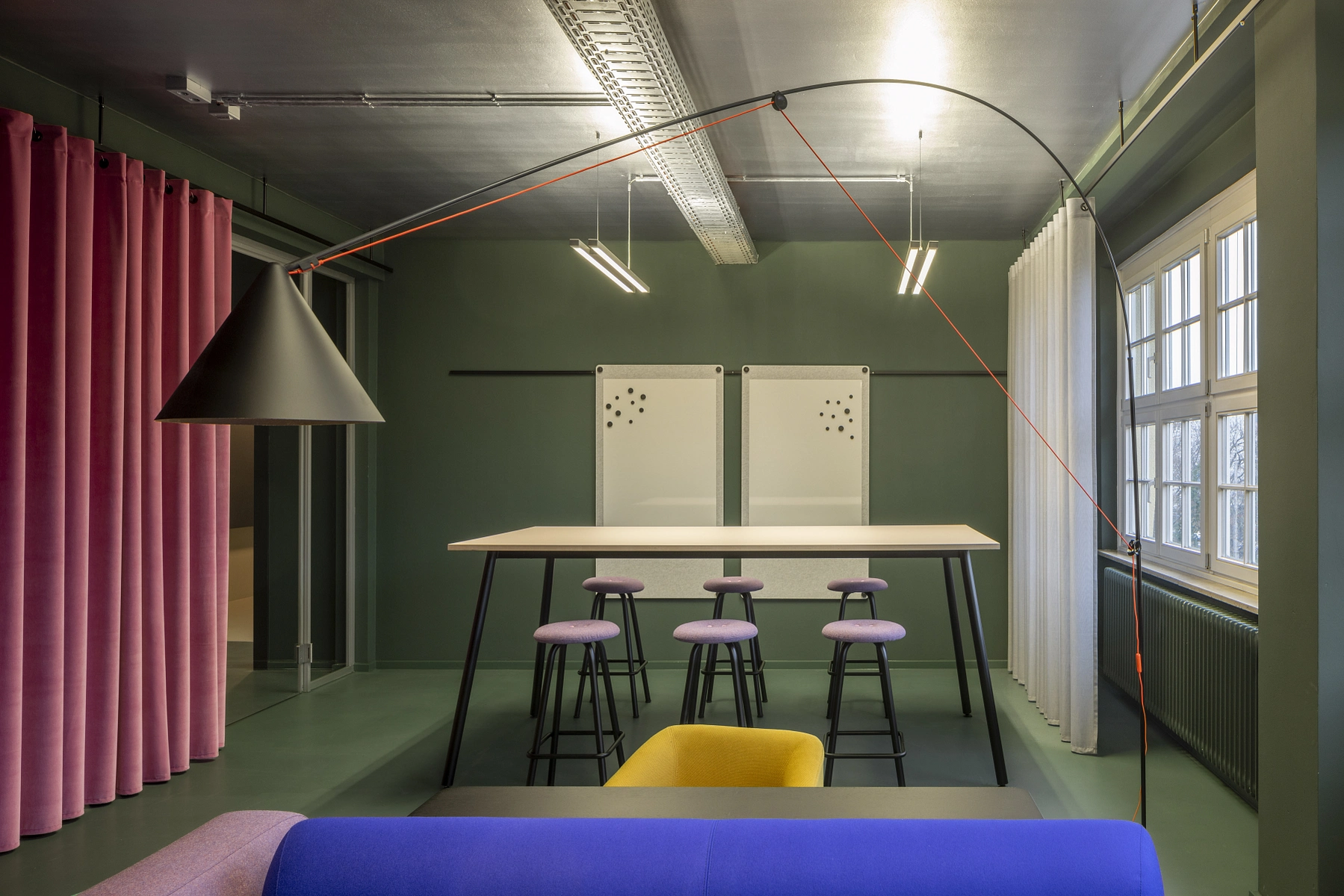 Kreativagentur auf Zeitreise. Der Bestand wurde genutzt, Zukunft ist eingezogen. Offene Räume, multifunktional, Farbakzente, … Kreativer Raum für kreative Mitarbeiter und Besucher. Spürbare Identität.